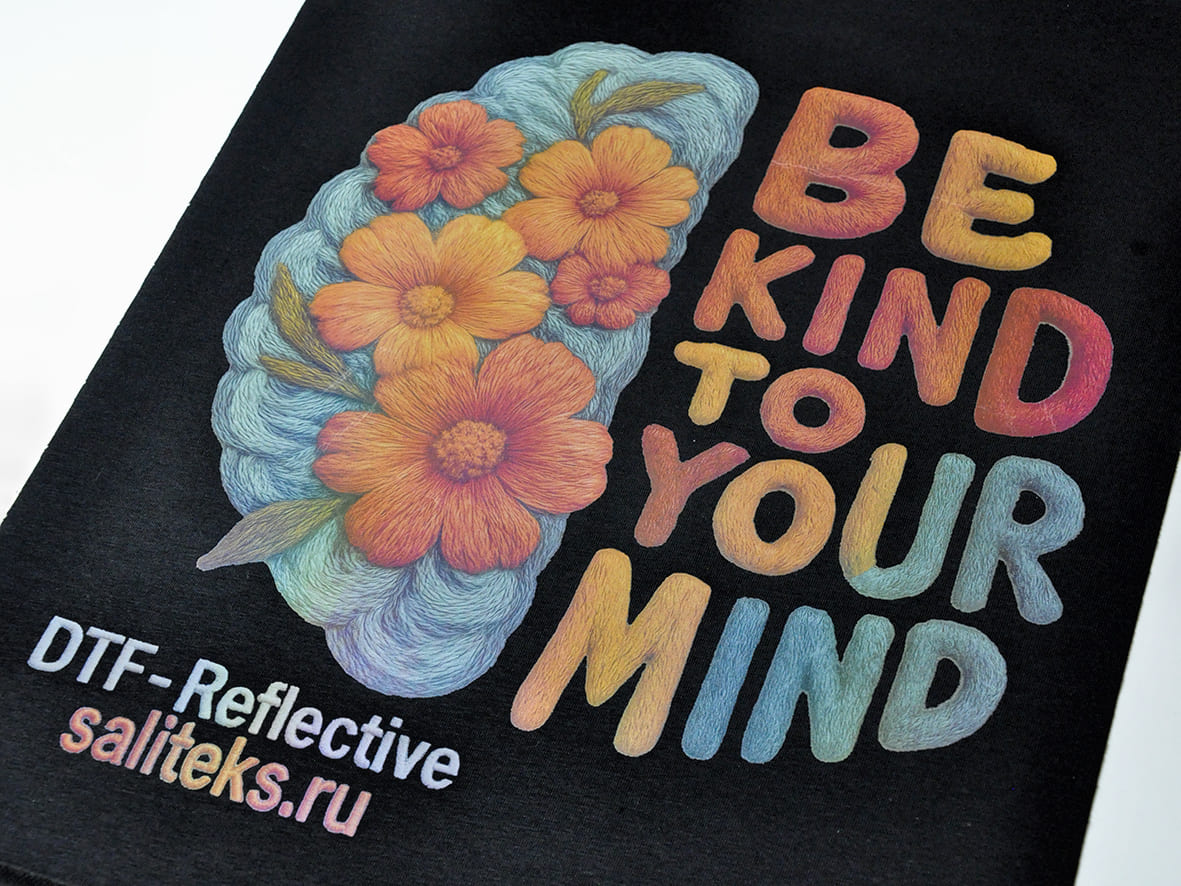 DTF под вышивку — это метод цифровой печати, при котором изображение сначала наносится на специальную пленку, а затем — с помощью термопресса — переносится на ткань любого типа: хлопок, полиэстер, смесовые материалы, а также сложные поверхности вроде сетки или трикотажа.