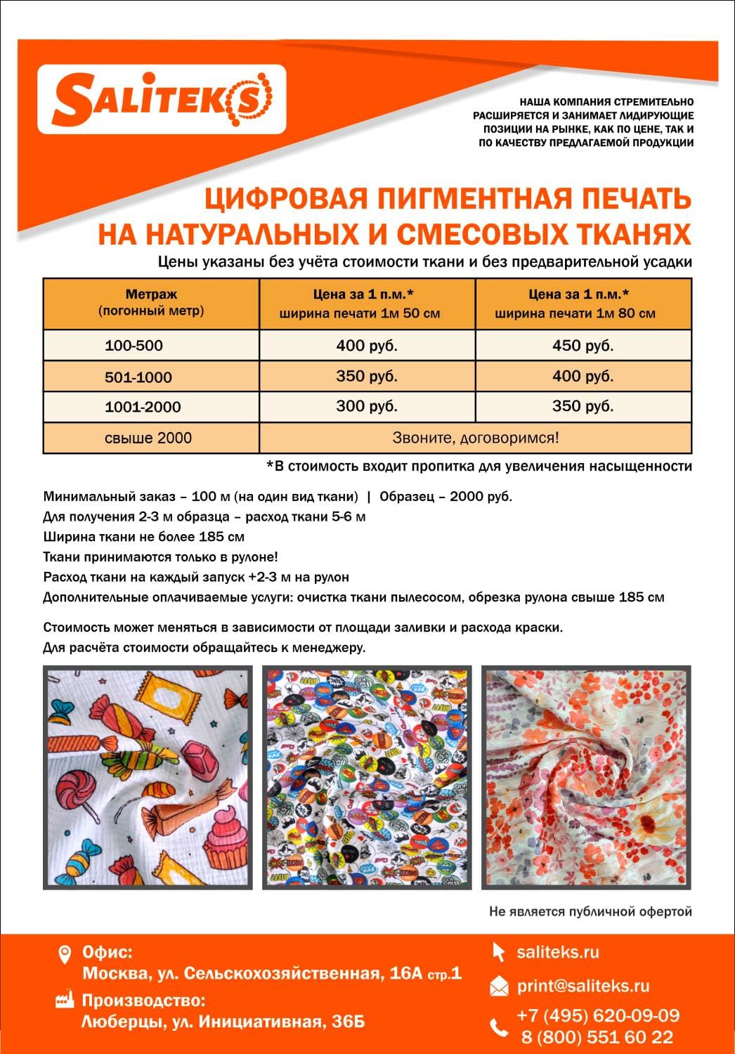 Компания «Салитекс» предоставляет услуги цифровой пигментной печати на материале клиента в Москве, принимаем заявки с области и других регионов России.