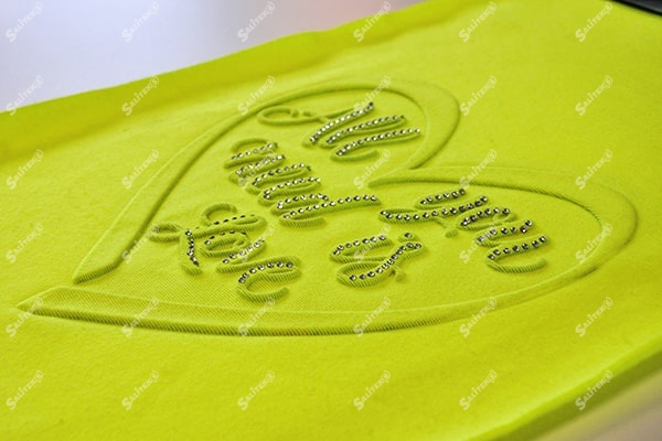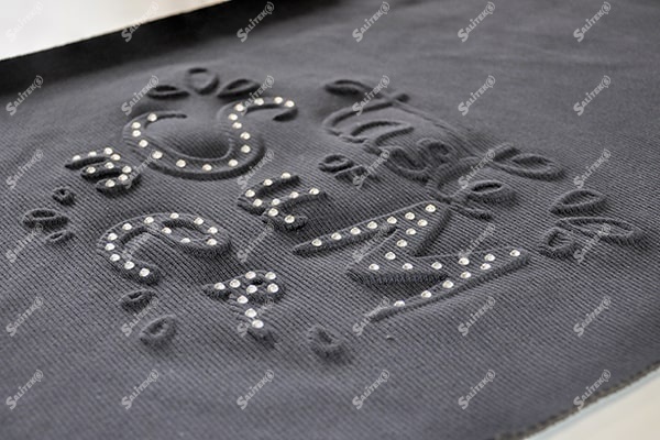 Эмбоссинг со стразами на ткани - способ ее декорирования при котором, отделочные стразы сначала монтируются на термопленку, а затем приклеиваются на тканевую основу под воздействием давления и температуры. Такая техника нанесения изображений, позволяет расставить оригинальные, стильные акценты на той или иной вещи, подчеркнуть ее индивидуальность, привлечь внимание.